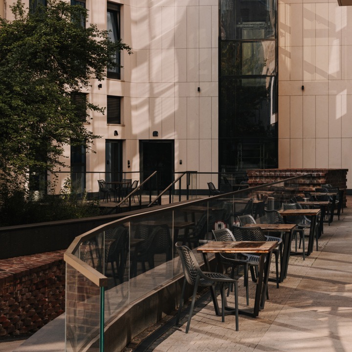 The stylish and relaxing hotel bar is the perfect place to unwind after a long day. We offer a wide selection of cocktails, an extensive wine list, and a variety of refreshing beverages. On warm days, the bar’s glass walls open fully to connect the interior with the patio, creating an intimate oasis in the heart of the city.