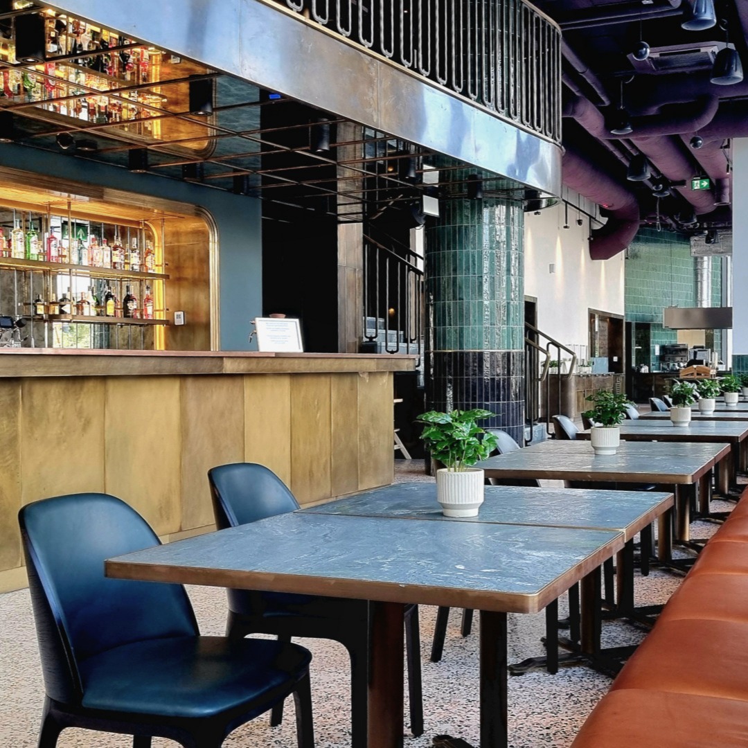 The hotel restaurant is a space where refined cuisine meets a warm and welcoming atmosphere. It is perfect for both a casual lunch and a special dinner. The spacious yet cozy interior combines leather, stone, brass, and bespoke terrazzo to create a timeless, elegant ambiance. From the main dining room and mezzanine, guests can enjoy a spectacular view of the Oder River and the outdoor sculpture Chair by Tadeusz Kantor — a true feast for the senses.